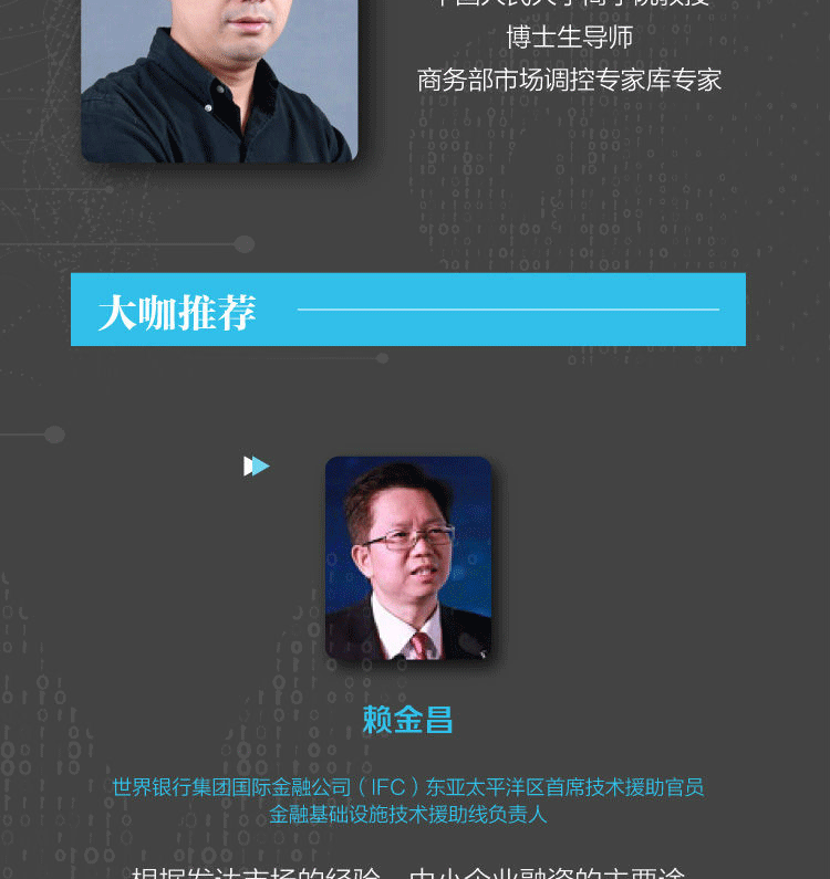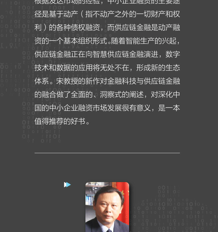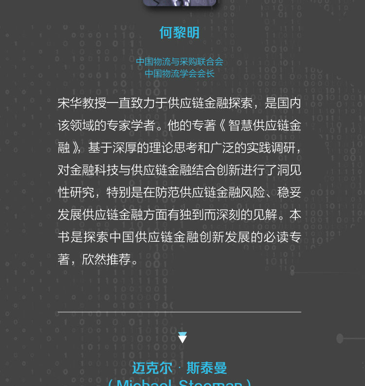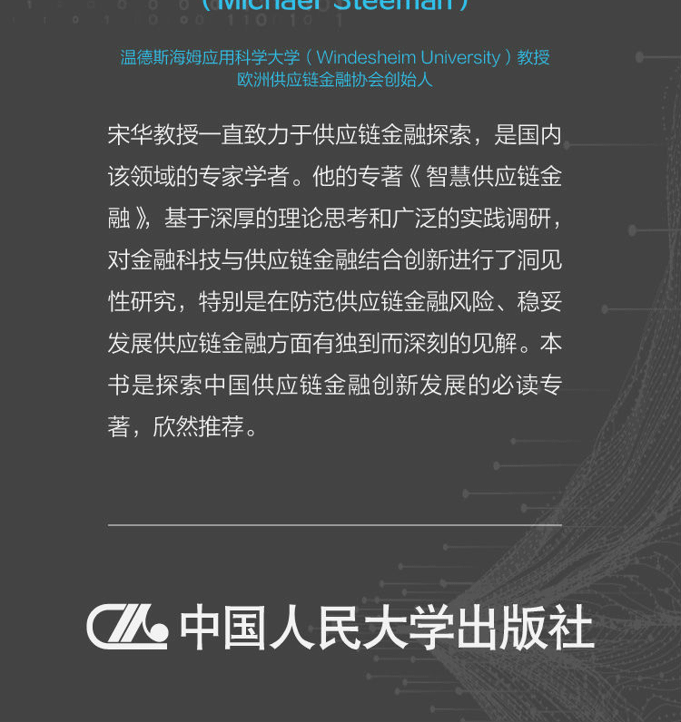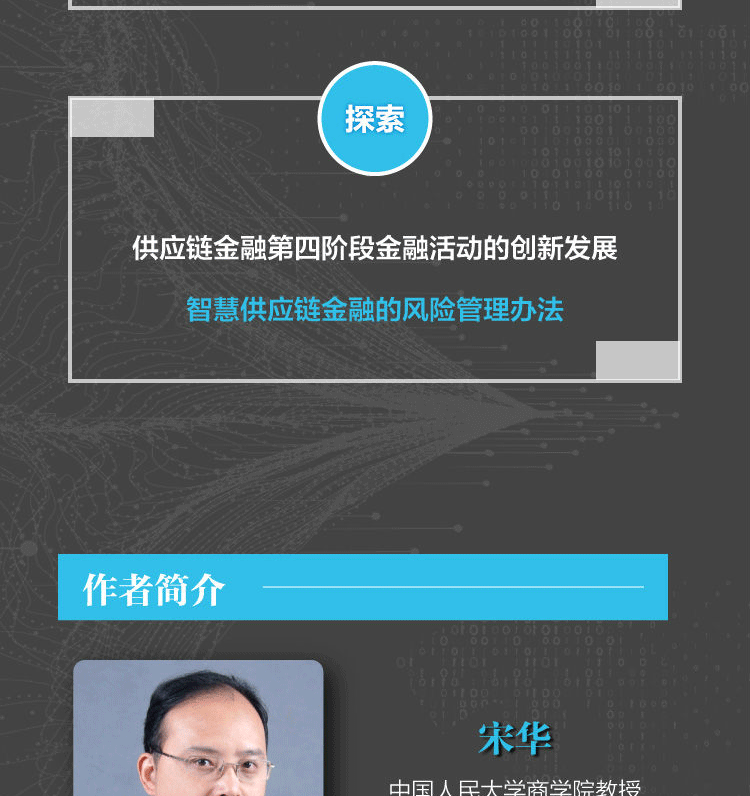 宋华,中国人民大学商学院教授,博士生导师,商务部市场调控专家库专家。主要研究领域为供应链物流管理和战略管理,多次承担和参加国家自然科学基金资助项目的研究。近年来已完成4部专著、3部译著,在国际、国内核心刊物上发表了40多篇论文,专著和译著有:《服务供应链》《供应链金融》《互联网供应链金融》《在平的世界中竞争》等。